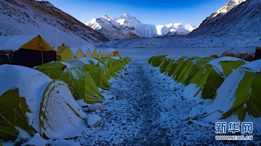 珠峰大本營的清晨,隊(duì)員睡覺的帳篷上覆蓋著積雪(5月3日攝)。新華社記者普布扎西攝
