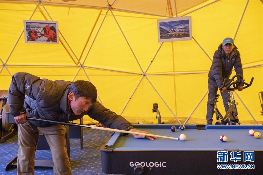 登山隊(duì)員在珠峰大本營內(nèi)打臺(tái)球(5月1日攝)。新華社記者孫非攝