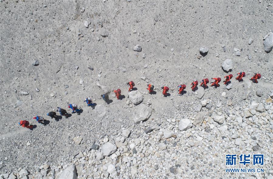 5月6日,登山隊(duì)員們向更高海拔進(jìn)發(fā)(無人機(jī)照片)。新華社記者孫非攝