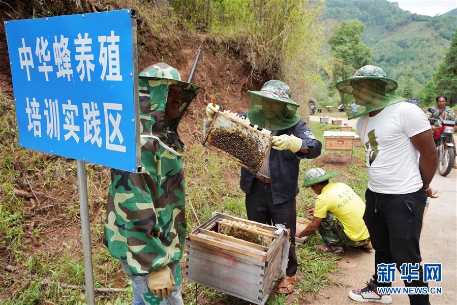 2020年5月3日,湖北省襄陽市,在南漳三道河水庫小島上,小島養(yǎng)蜂人趙德海每天要巡視蜂箱,查看蜂箱的蜜蜂密集度和蜜蜂繁殖情況,及時調(diào)整,才能避免蜜蜂受損。