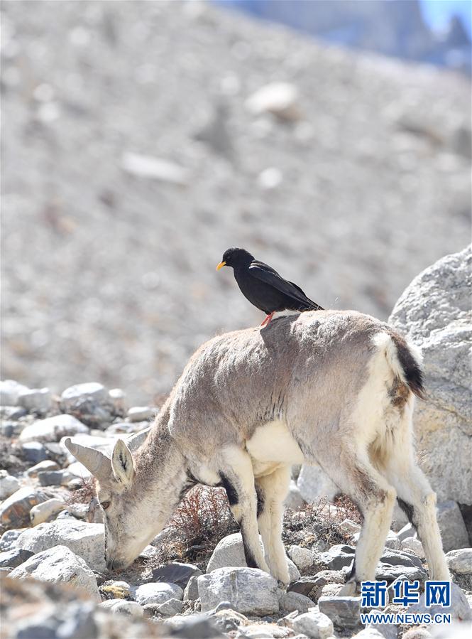 黃嘴山鴉停在巖羊背上(5月8日攝)。當(dāng)日,一群巖羊在珠峰大本營周圍覓食,黃嘴山鴉飛到巖羊身上停留,構(gòu)成一幅幅生動(dòng)有趣的雪域圖畫。新華社記者普布扎西攝