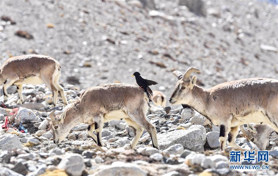 黃嘴山鴉停留在巖羊身上(5月8日攝)。當(dāng)日,一群巖羊在珠峰大本營周圍覓食,黃嘴山鴉飛到巖羊身上停留,構(gòu)成一幅幅生動(dòng)有趣的雪域圖畫。新華社記者晉美多吉攝