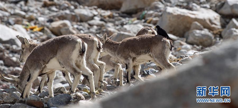 黃嘴山鴉停在巖羊背上(5月8日攝)。當日,一群巖羊在珠峰大本營周圍覓食,黃嘴山鴉飛到巖羊身上停留,構(gòu)成一幅幅生動有趣的雪域圖畫。新華社記者普布扎西攝