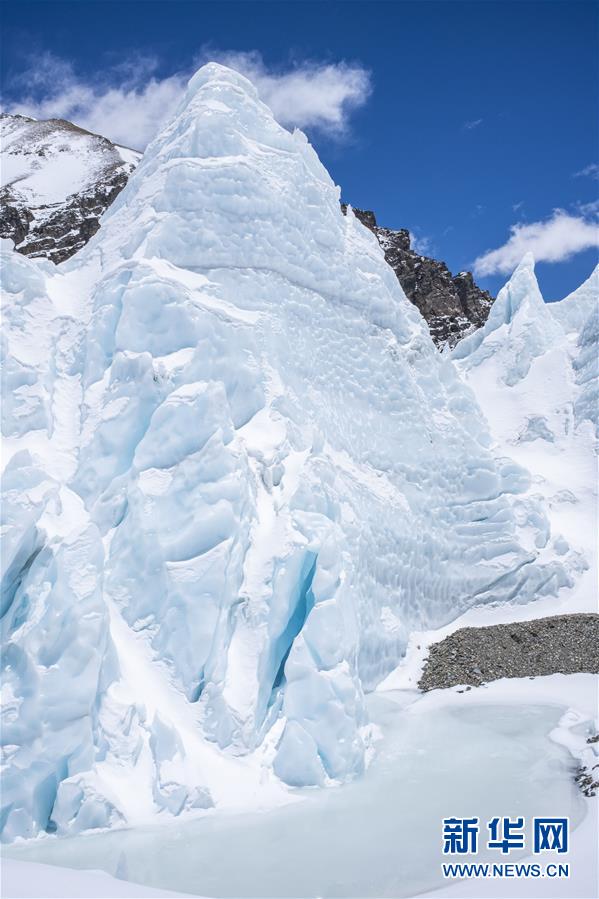 珠峰海拔5800米至海拔6500米的冰塔林(5月9日攝)。從海拔5800米的珠峰過(guò)渡營(yíng)地到海拔6500米的前進(jìn)營(yíng)地,冰塔林沿山谷排列,蔚為壯觀。新華社記者孫非攝