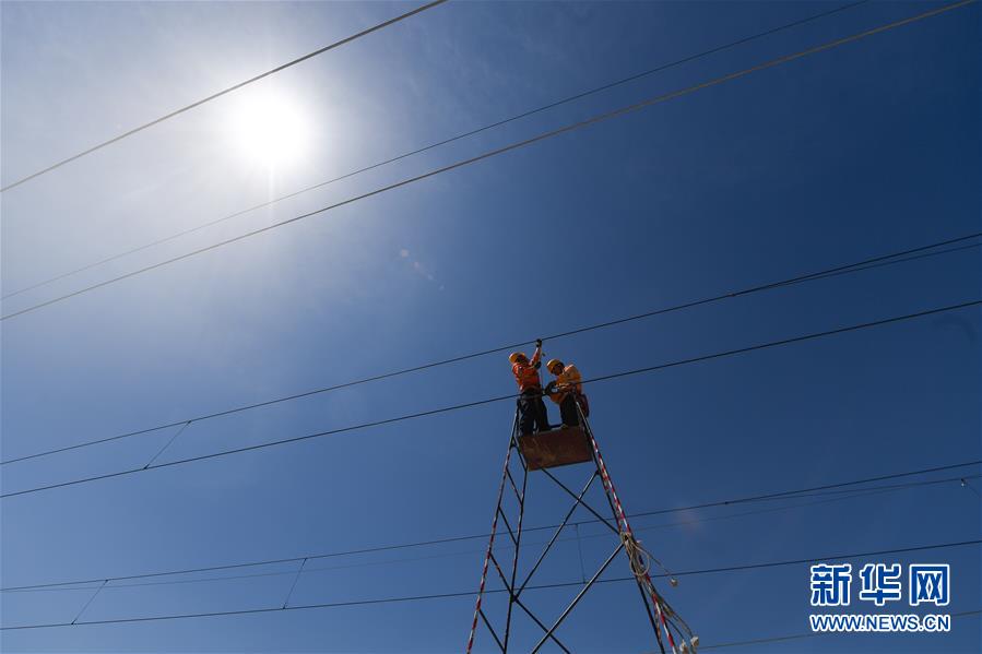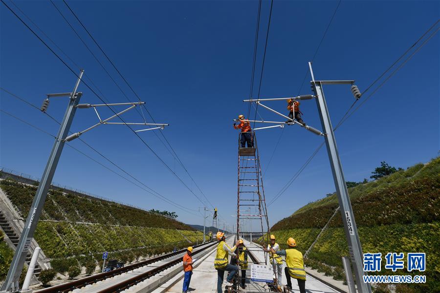 5月12日,中國鐵路上海局集團公司上海高鐵維修段的技術人員在商合杭高鐵浙江湖州段調(diào)整接觸網(wǎng)。近日,商合杭高鐵合肥至湖州段聯(lián)調(diào)聯(lián)試正有條不紊進行中。中國鐵路上海局集團公司上海高鐵維修段抽調(diào)49名精兵強將,持續(xù)對管轄范圍內(nèi)的高鐵線路、信號、接觸網(wǎng)線進行調(diào)試,為下一階段打下基礎。據(jù)了解,商合杭高鐵合湖段聯(lián)調(diào)聯(lián)試之后將轉(zhuǎn)入運行試驗階段,驗收合格并通過安全評估后,力爭6月底具備開通運營條件。新華社記者黃宗治攝