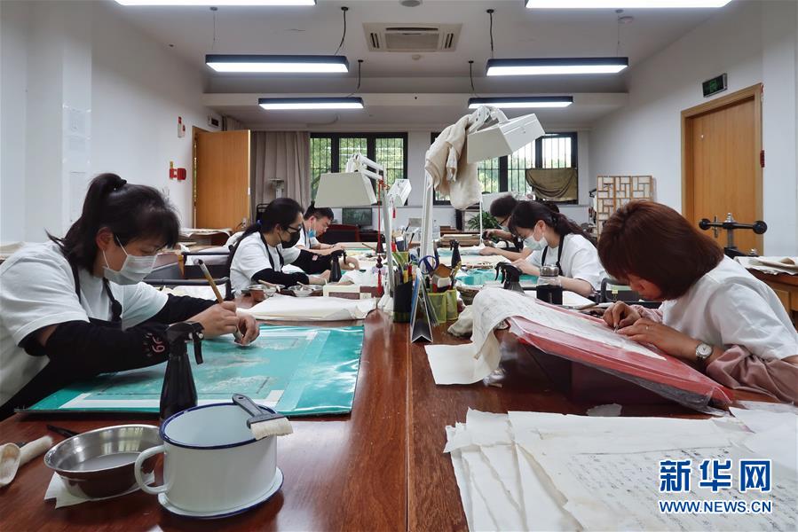 5月13日,古籍修復師在對書頁進行修復。天一閣藏品修復部目前有修復師14人,每年約修復古籍14000余頁。據介紹,修復一冊古籍通常需要1至2個月,有的甚至需要1年以上。新華社記者鄭夢雨攝
