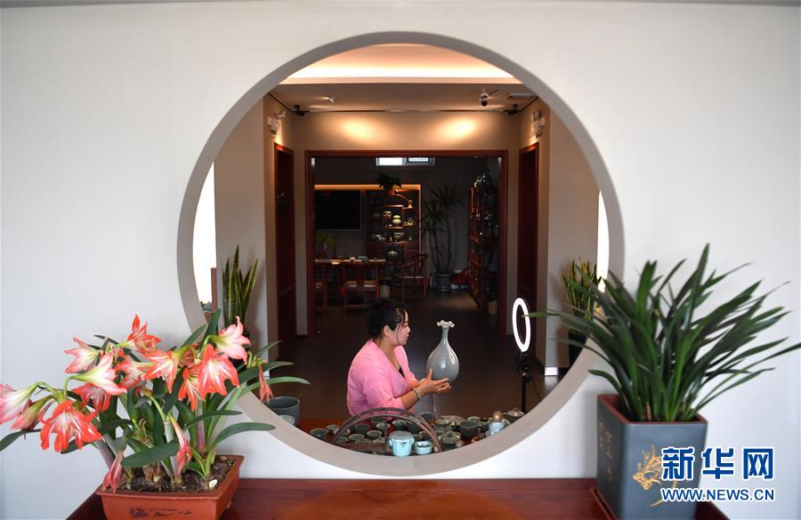 5月13日,寶豐縣大營(yíng)鎮(zhèn)的汝瓷藝人李瑩娟在宣和汝瓷展廳直播介紹汝瓷產(chǎn)品。新華社記者李嘉南攝