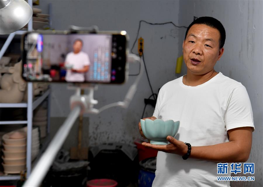5月13日,寶豐縣大營(yíng)鎮(zhèn)的汝瓷藝人宋召冰在汝瓷作坊直播介紹汝瓷產(chǎn)品。新華社記者李嘉南攝