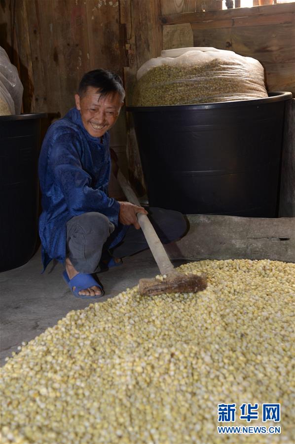 5月14日,在貴州省畢節(jié)市百里杜鵑管理區(qū)黃泥鄉(xiāng)龍?zhí)链逡患揖谱鞣唬迕駥?duì)玉米進(jìn)行發(fā)酵。貴州省畢節(jié)市百里杜鵑管理區(qū)黃泥鄉(xiāng)龍?zhí)链宓凝執(zhí)凉啪?,因?dú)特的古法釀酒技術(shù),口感獨(dú)特而遠(yuǎn)近聞名。全村有釀酒戶142戶,年產(chǎn)量達(dá)45萬(wàn)多公斤,龍?zhí)凉啪七h(yuǎn)銷重慶、廣東、浙江等地,龍?zhí)凉啪埔殉蔀辇執(zhí)寥嗽鍪盏闹匾獊?lái)源。新華社記者楊楹攝