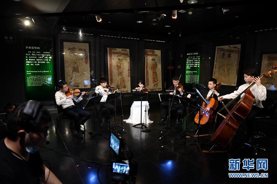 在陜西歷史博物館唐代壁畫珍品館,西安交響樂團小提琴首席周虎翼、第二小提琴首席白東旭、第二小提琴演奏員葉姣睿、中提琴演奏員時少愷、大提琴演奏員于丁和低音提琴演奏員趙子杰(從左至右)為“云上國寶”音樂會彩排(5月14日攝)。為迎接國際博物館日,5月14日,西安交響樂團走進陜西歷史博物館唐代壁畫珍品館,為5月18日的“云上國寶”音樂會彩排。觀眾將通過網絡直播,在聆聽天籟的同時欣賞國之瑰寶,感受藝術與美的和諧共鳴。新華社記者李一博攝
