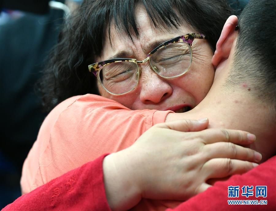 5月18日,李靜芝(左)與失散32年的兒子毛寅團聚時落淚。新華社記者張博文攝