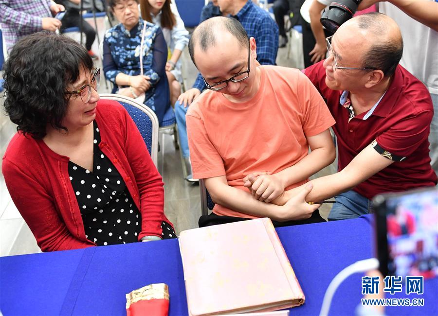 5月18日,李靜芝(左)、毛振平(右)與失散32年的兒子毛寅團聚。新華社記者張博文攝