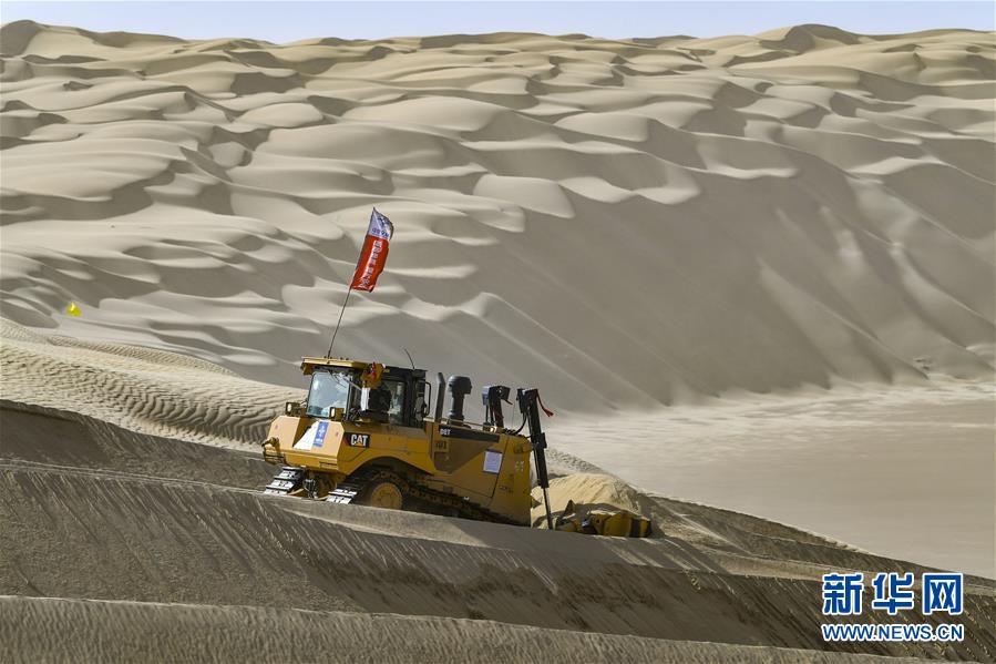 在新疆尉犁至且末沙漠公路施工現(xiàn)場(chǎng),工人駕駛大型推土機(jī)推平沙山(5月16日攝)。新華社記者胡虎虎攝
