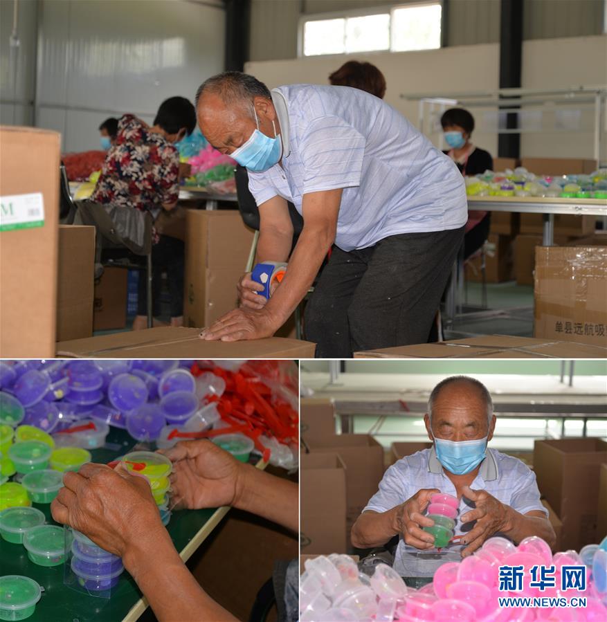 這是一張拼版照片(圖片均為5月16日攝)。上圖:在河南省開(kāi)封市尉氏縣大橋鄉(xiāng)馮村扶貧車(chē)間,65歲的鄭春嶺用膠帶把裝滿玩具的紙箱封上。依靠村內(nèi)扶貧車(chē)間,他走上致富的道路;下左圖、下右圖:鄭春嶺在打包玩具。新華社記者孫清清攝
