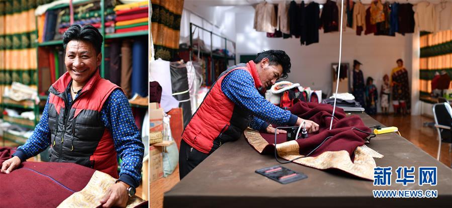 拼版照片:左圖為西藏昌都市江達(dá)縣字嘎鄉(xiāng)塔字村村民扎西江措;右圖為扎西江措在西藏昌都市江達(dá)縣格?;褡宸椉庸やN售公司制作藏裝。扎西江措學(xué)習(xí)藏裝縫制不到兩年時(shí)間,已經(jīng)是一名熟練的制衣工,現(xiàn)在月收入4000多元。在此之前,扎西江措靠放牧、四處打零工養(yǎng)活一家人(4月30日攝)。新華社記者詹彥攝