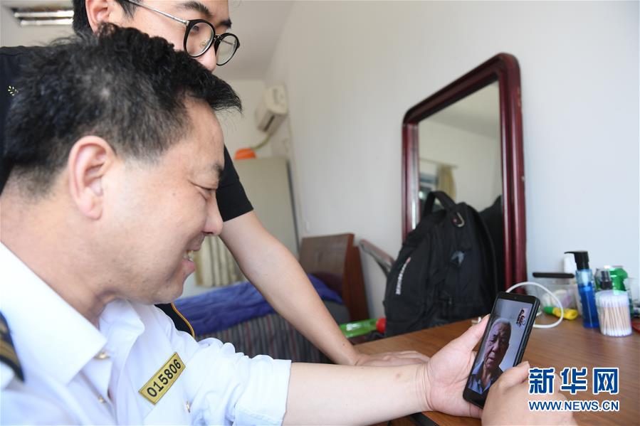 5月20日,在寧波七里嶼,前來運送物資的葉家第四代燈塔工葉靜虎(前)和兒子葉超群在宿舍內(nèi)跟第三代燈塔工葉中央視頻通話。葉超群自2013年起在七里嶼燈塔工作,葉靜虎從燈塔工崗位上退下來后,目前在寧波航標處后勤事務中心工作。新華社記者翁忻旸攝