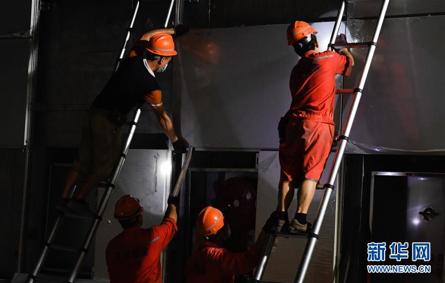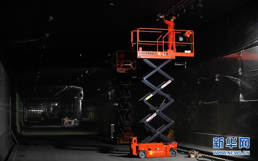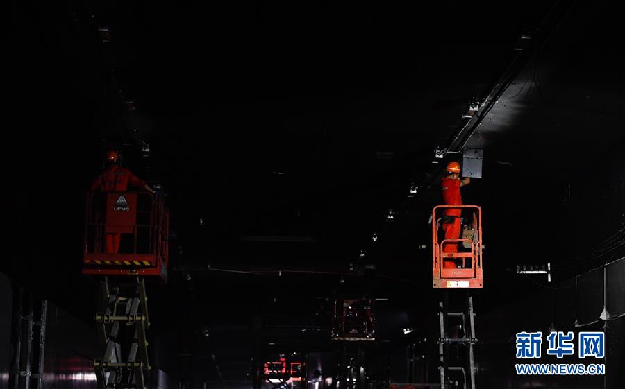 5月23日,工人在海口文明東越江通道項(xiàng)目隧道內(nèi)安裝照明設(shè)備。新華社記者楊冠宇攝