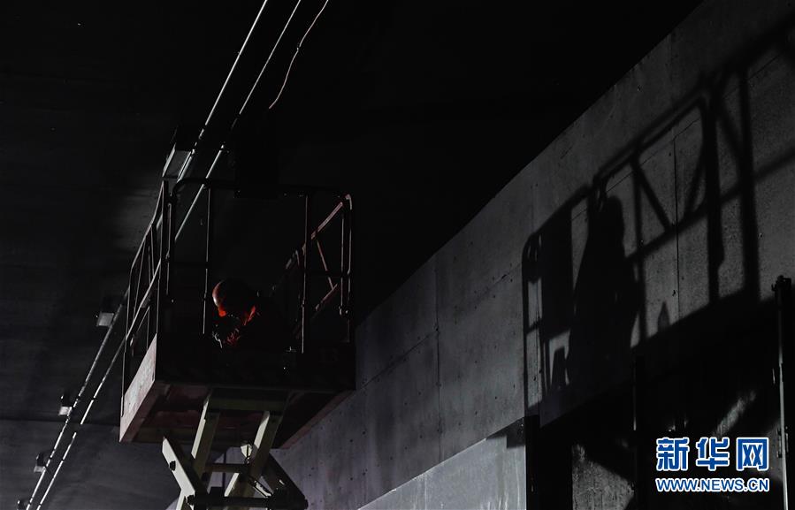 5月23日,工人在海口文明東越江通道項(xiàng)目隧道內(nèi)安裝照明設(shè)備。新華社記者楊冠宇攝