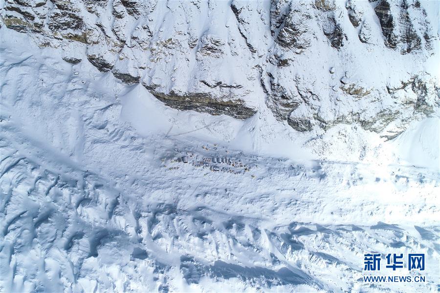 位于珠峰東絨布冰川旁海拔6500米的珠峰前進(jìn)營(yíng)地(5月22日攝,無(wú)人機(jī)照片)。