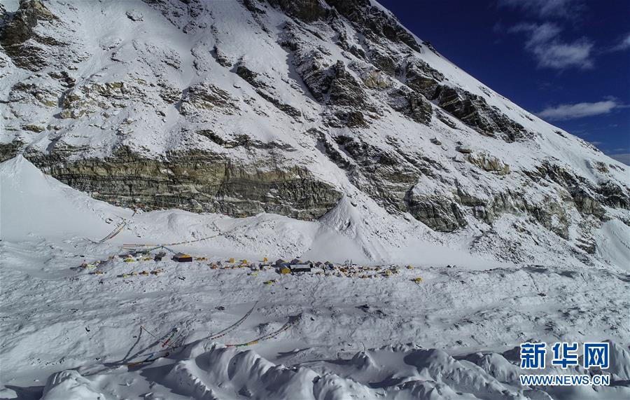 位于珠峰東絨布冰川旁海拔6500米的珠峰前進(jìn)營地(5月22日攝,無人機(jī)照片)。