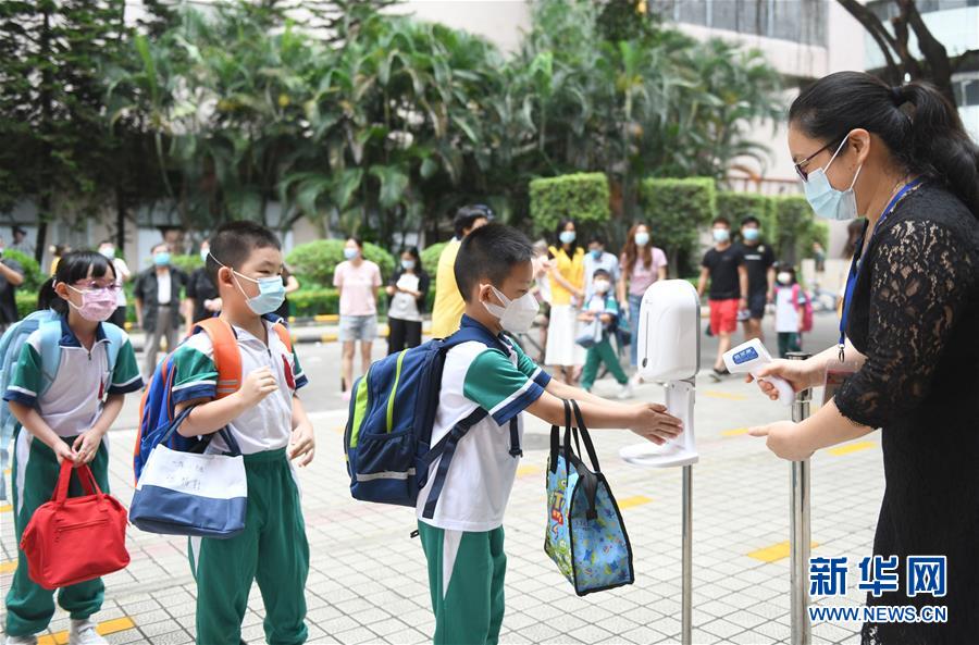 5月25日,廣州市荔灣區(qū)蔣光鼐紀(jì)念小學(xué)的老師在校門口為返校學(xué)生檢測體溫。當(dāng)日,廣州市各小學(xué)一至三年級學(xué)生正式開學(xué)復(fù)課。至此,廣州市中小學(xué)各年級已全部開學(xué)復(fù)課。新華社記者盧漢欣攝