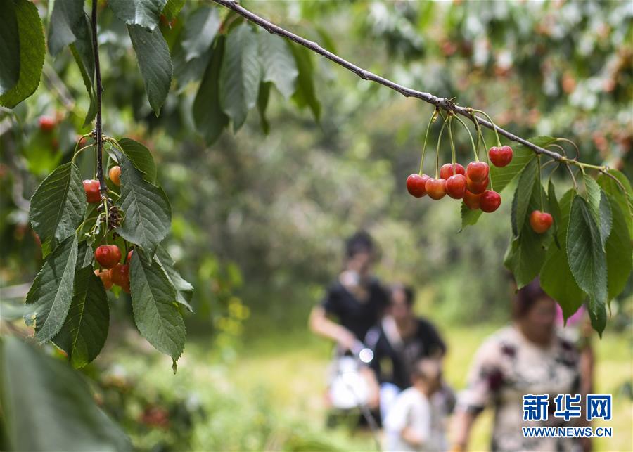 5月25日,在新疆莎車(chē)縣米夏鎮(zhèn)夏馬勒巴格村,游客在櫻桃采摘園里觀光。新華社記者王菲攝