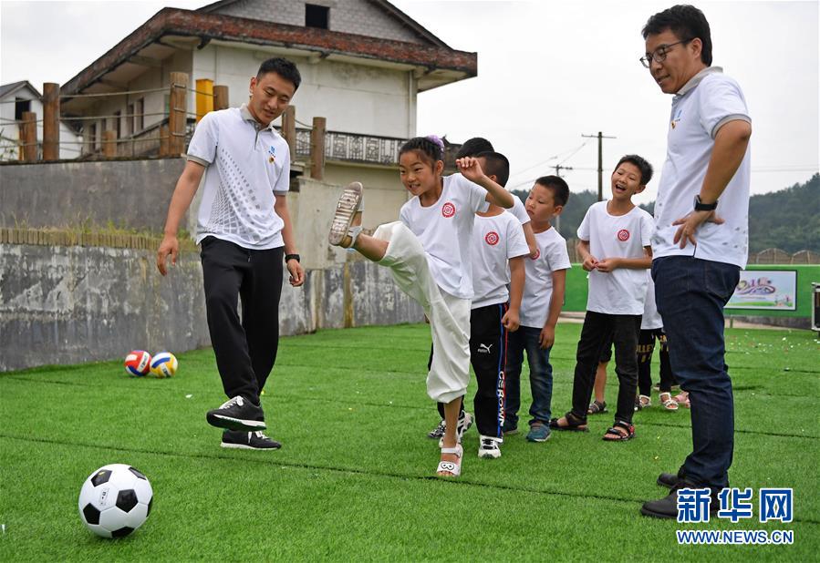 5月27日,在江西省貴溪市金屯鎮(zhèn)金屯村渡坊村小組,志愿者和留守兒童一起進(jìn)行體育活動(dòng)。新華社記者萬象攝