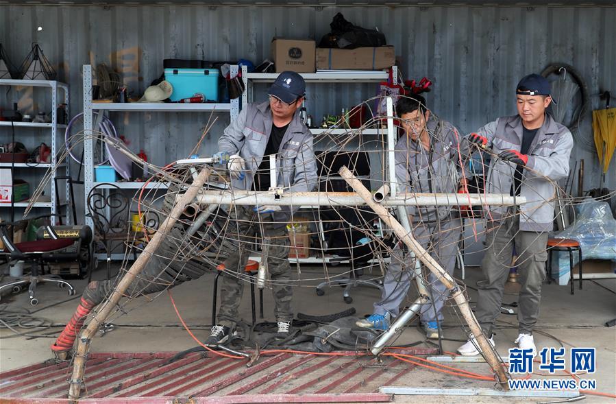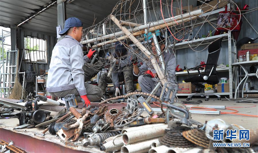 5月27日,制作團(tuán)隊(duì)成員李剛在中轉(zhuǎn)服務(wù)站工棚內(nèi),用廢舊鋼絲制作牛造型工藝品的身體部分。新華社記者方喆攝