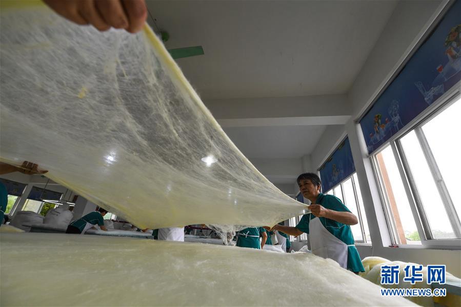 5月27日,在位于桐鄉(xiāng)市洲泉鎮(zhèn)的浙江蠶緣家紡股份有限公司內,工作人員把加工好的黃金蠶絲進行“拉絲綿”工序,準備用于制作蠶絲被。新華社記者徐昱攝