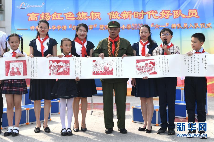 5月29日,孩子們向李延年贈(zèng)送“紅色畫(huà)卷”?!傲弧眹?guó)際兒童節(jié)來(lái)臨之際,“共和國(guó)勛章”獲得者、老一輩戰(zhàn)斗英雄李延年來(lái)到廣西南寧市濱湖路小學(xué)給孩子們講述戰(zhàn)爭(zhēng)年代的紅色故事,寄語(yǔ)他們好好學(xué)習(xí)、努力奮斗。孩子們向李延年贈(zèng)送了師生共繪的“紅色畫(huà)卷”,向老英雄致敬。新華社記者周華攝