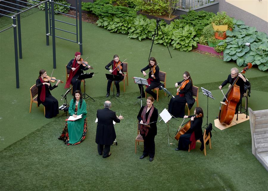 5月30日,在奧地利維也納“時代精神”酒店的庭院內(nèi),歌劇樂團為觀眾演出。當(dāng)日,奧地利首都維也納的一家名為“時代精神”的酒店為迎接“解封”后恢復(fù)營業(yè),在其庭院內(nèi)舉辦“窗口音樂會”。按照奧政府此前公布的“解封”時間表,從29日起,賓館酒店以及健身房、游泳池和游樂場等休閑娛樂場所有條件恢復(fù)運營。新華社記者郭晨攝