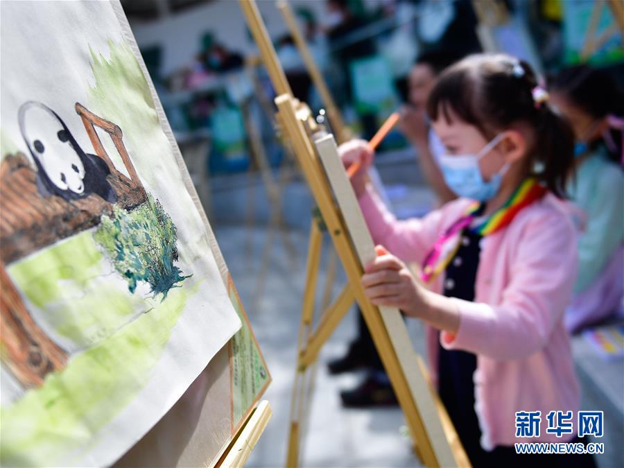 5月31日,小朋友在西寧熊貓館內(nèi)繪畫。新華社記者張龍攝