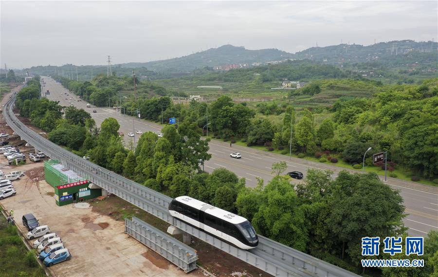 6月3日,一臺“云巴”在專用運(yùn)行軌道上進(jìn)行調(diào)試(無人機(jī)照片)。近日,重慶市首條“云巴”示范線項(xiàng)目在重慶璧山區(qū)正式亮相。此次發(fā)布的“云巴”采用電能驅(qū)動,具有轉(zhuǎn)彎半徑小、爬坡能力強(qiáng)、噪音低、安全性高、建設(shè)成本低、建造周期短等優(yōu)勢,能為乘客提供更智能、舒適、便捷的出行體驗(yàn)。據(jù)介紹,璧山區(qū)“云巴”示范線項(xiàng)目自2019年8月開建,線路正線全長15.4km,共設(shè)車站15座,預(yù)計(jì)2020年9月全線通車。新華社記者劉潺攝。