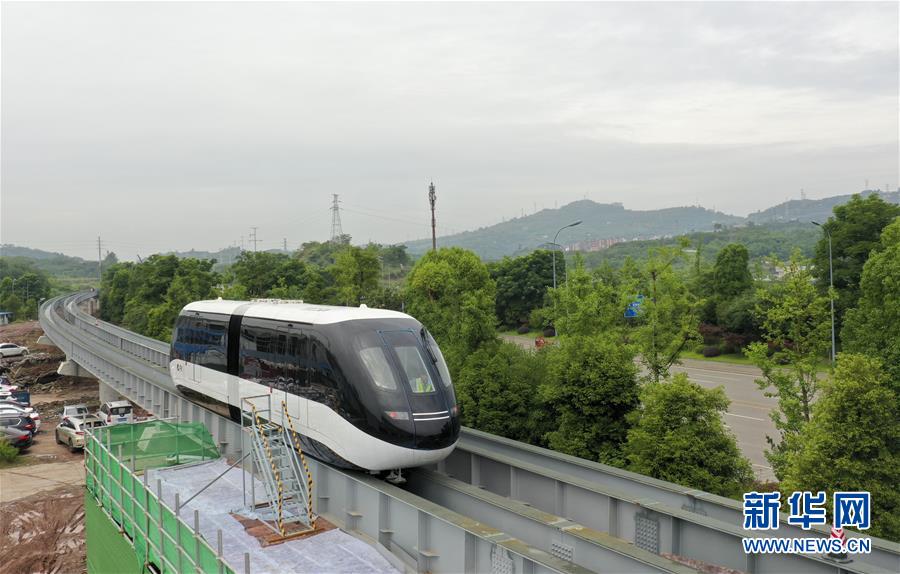 6月3日,一臺(tái)“云巴”在專用運(yùn)行軌道上進(jìn)行調(diào)試(無人機(jī)照片)。近日,重慶市首條“云巴”示范線項(xiàng)目在重慶璧山區(qū)正式亮相。此次發(fā)布的“云巴”采用電能驅(qū)動(dòng),具有轉(zhuǎn)彎半徑小、爬坡能力強(qiáng)、噪音低、安全性高、建設(shè)成本低、建造周期短等優(yōu)勢(shì),能為乘客提供更智能、舒適、便捷的出行體驗(yàn)。據(jù)介紹,璧山區(qū)“云巴”示范線項(xiàng)目自2019年8月開建,線路正線全長(zhǎng)15.4km,共設(shè)車站15座,預(yù)計(jì)2020年9月全線通車。新華社記者劉潺攝。