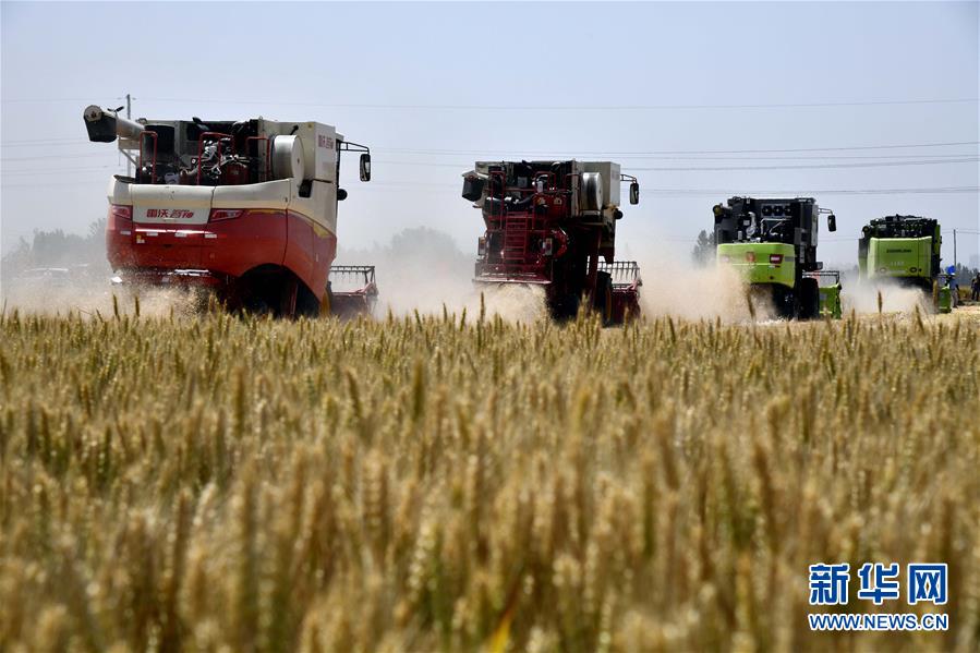 6月3日,在汶上縣郭倉(cāng)鎮(zhèn),收割機(jī)在收獲小麥。目前,我國(guó)第二大小麥主產(chǎn)區(qū)山東6000多萬(wàn)畝小麥進(jìn)入收獲階段。農(nóng)民們搶抓有利天氣,自南向北陸續(xù)開(kāi)鐮。新華社記者郭緒雷攝。