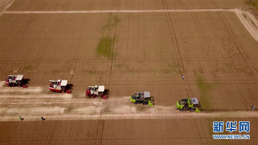 6月3日,收割機(jī)在汶上縣郭倉(cāng)鎮(zhèn)的麥田里收獲小麥(無(wú)人機(jī)航拍)。目前,我國(guó)第二大小麥主產(chǎn)區(qū)山東6000多萬(wàn)畝小麥進(jìn)入收獲階段。農(nóng)民們搶抓有利天氣,自南向北陸續(xù)開(kāi)鐮。新華社記者郭緒雷攝。