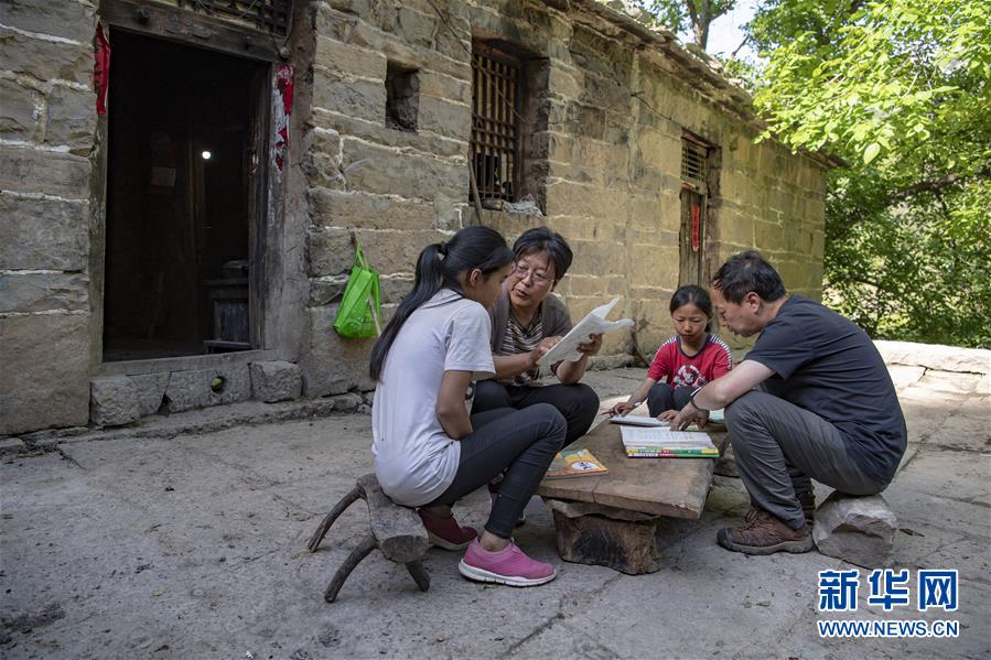 馬武寨寄宿制小學語文老師崔連瑞(左二)和校長趙金成在南背村三姐弟的家里為孩子們輔導功課(5月31日攝)。新華社記者楊晨光攝。