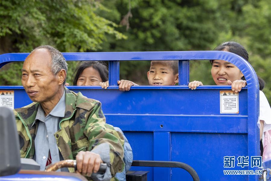 6月2日,秦春蘭、秦秋蘭和秦興旺姐弟三人乘坐父親駕駛的三輪車前往學校。新華社記者楊晨光攝。