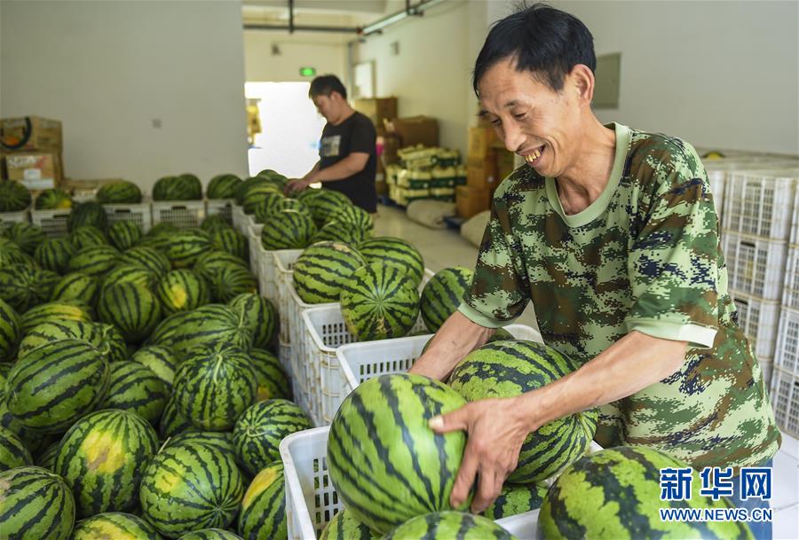6月3日,村民在深州市鮮天下電商公司扶貧專區(qū)搬運西瓜。今年以來,河北省深州市圍繞決勝全面小康、決戰(zhàn)脫貧攻堅任務目標,在推進產(chǎn)業(yè)扶貧的過程中注重激發(fā)內(nèi)生動力,通過電商扶貧、扶貧車間、特色種植養(yǎng)殖等多種形式,提升自我“造血”功能,提高貧困群眾受益度。新華社記者李曉果攝。