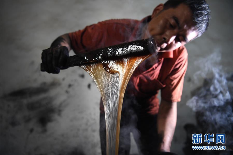5月20日,安徽歙縣“項氏徽墨”的工人在熬膠。熬好的骨膠和煙灰混合后制作成墨泥。新華社記者劉軍喜攝。