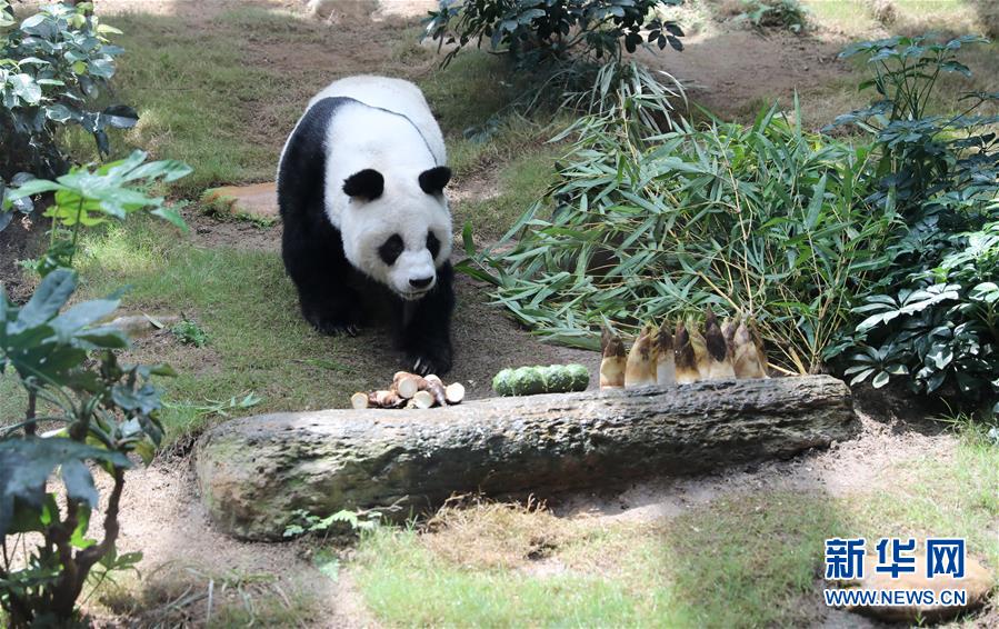 在香港海洋公園展區(qū),大熊貓“安安”走向美食(5月11日攝)。新華社記者吳曉初攝