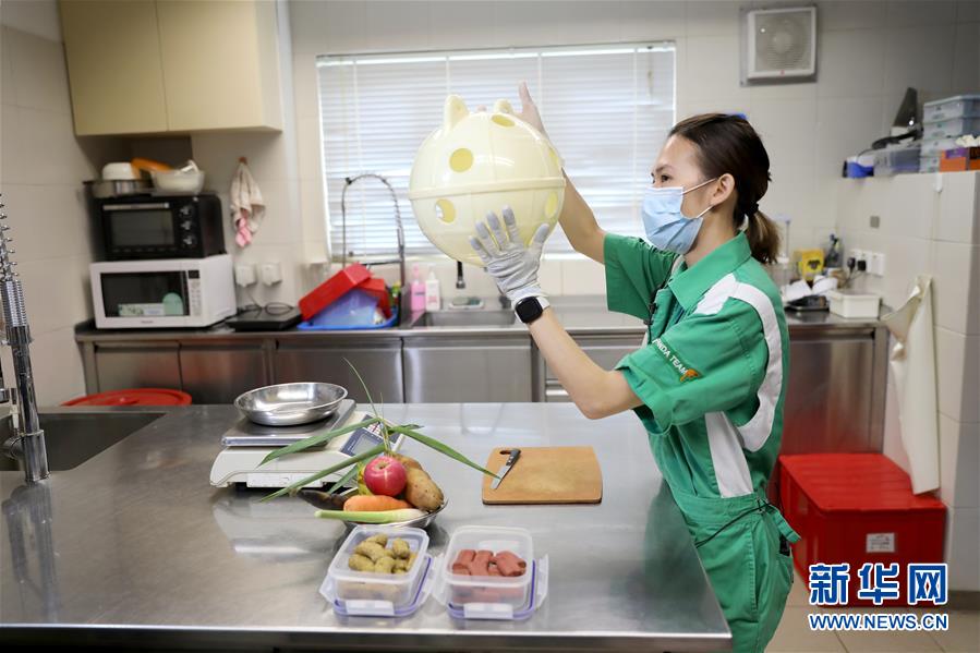 香港海洋公園陸生動物部監(jiān)督殷漫萍在熊貓廚房介紹對熊貓的訓練(5月11日攝)。新華社記者吳曉初攝