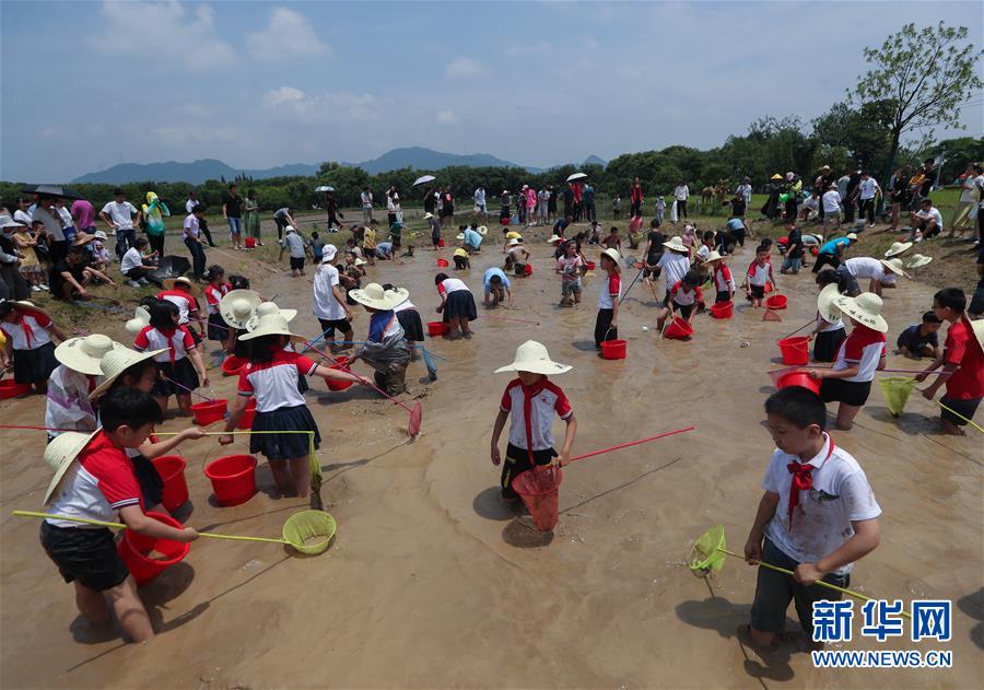6月7日,孩子和家長們參加渾水摸魚趣味活動(dòng)。新華社記者徐昱攝