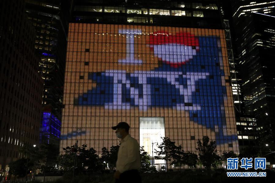 6月7日,美國紐約世貿(mào)中心一號樓外墻呈現(xiàn)出“我愛紐約”字樣。當日,紐約州多處建筑點亮藍色和金色燈光,及用燈光效果呈現(xiàn)出“紐約堅強”、“我愛紐約”等字樣,致敬紐約民眾團結抗擊疫情。新華社記者王迎攝