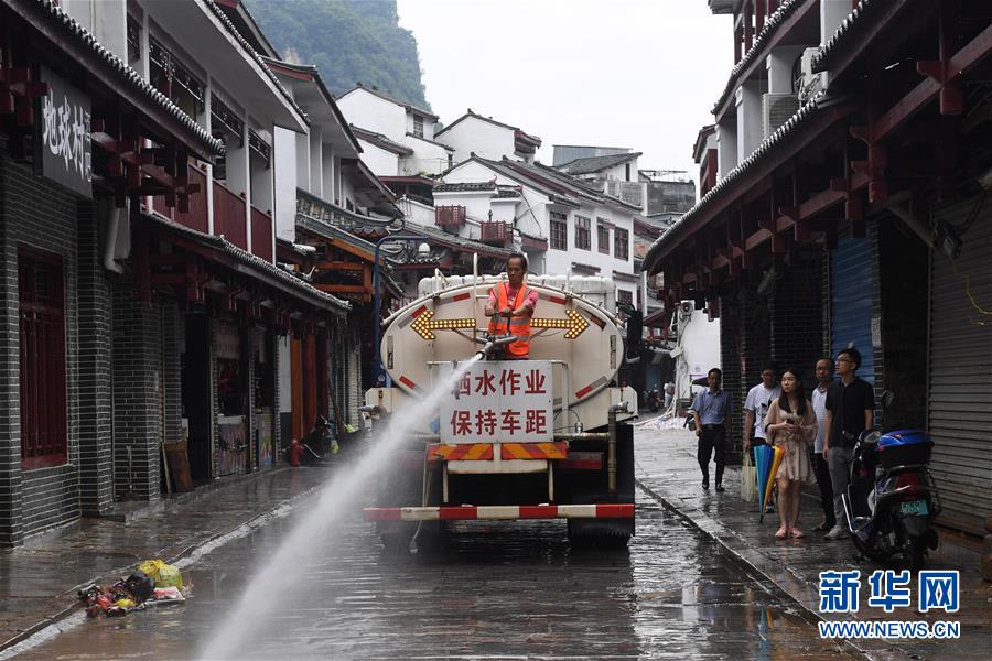 6月8日,在廣西陽(yáng)朔縣西街,環(huán)衛(wèi)工人在沖洗被洪水浸泡的街道。6月6日至8日,廣西陽(yáng)朔縣普降暴雨,局部降特大暴雨,全縣9個(gè)鄉(xiāng)鎮(zhèn)出現(xiàn)洪澇災(zāi)害。目前,全縣正有序開(kāi)展災(zāi)后生產(chǎn)生活恢復(fù)。新華社記者陸波岸攝