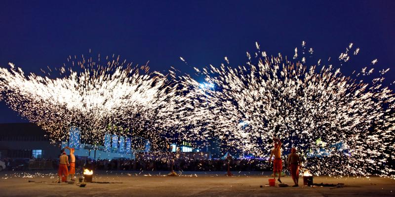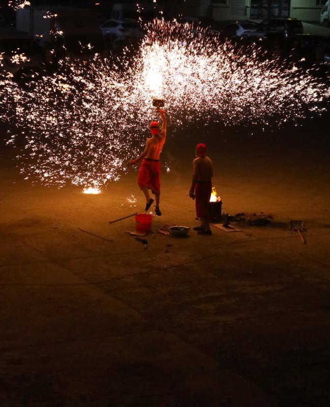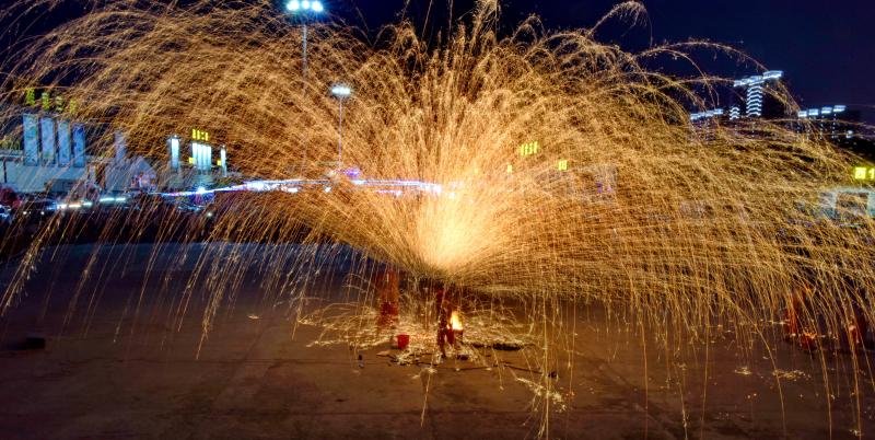 2020年6月7日晚8時(shí)許,吉林長(zhǎng)春青岡立交橋附近,神韻打鐵花表演隊(duì)改進(jìn)了傳統(tǒng)單一的擊打鐵花的形式,增添了空中轉(zhuǎn)花、高空散花、鋪地印花等多種花型。一柱鐵花沖天,在空中盤(pán)旋,朵朵銀花綻放給觀眾帶來(lái)了震撼的視覺(jué)享受。