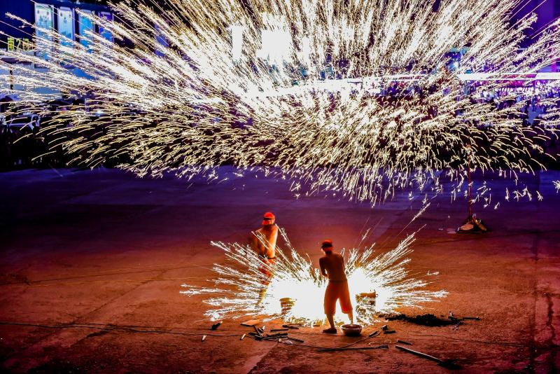 2020年6月7日晚8時(shí)許,吉林長(zhǎng)春青岡立交橋附近,打鐵花時(shí),先把熔好的鐵汁注入事先準(zhǔn)備好的“花棒”。一個(gè)拳頭粗細(xì)、一尺多長(zhǎng)的柳樹(shù)棒,棒的頂端掏有直徑3厘米的圓形坑槽,用以盛放鐵汁。打鐵花者一手拿著盛有鐵汁的“花棒”,用下棒猛擊盛有鐵汁的上棒,使棒中鐵汁沖向花棚,鐵汁遇到棚頂?shù)牧Χ派⒊鼍薮蟮幕鸹?。五彩繽紛、震天動(dòng)地。