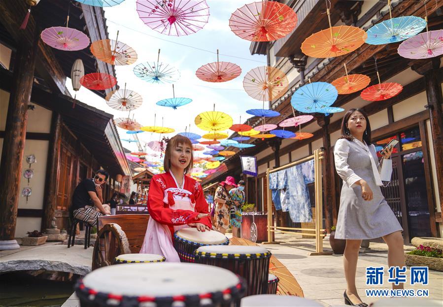 6月13日,在長春市世茂蓮花山小鎮(zhèn)寬厚里商街,一名古裝愛好者演奏手鼓。當日是“文化和自然遺產日”。吉林長春首屆蓮花山消夏生活節(jié)在世茂蓮花山小鎮(zhèn)舉行?;顒訉⒎沁z展示與假日消暑休閑相結合,讓游人在“古色古香”的油紙傘巷中品傳統(tǒng)文化魅力,享夏日休閑愜意。新華社記者許暢攝。