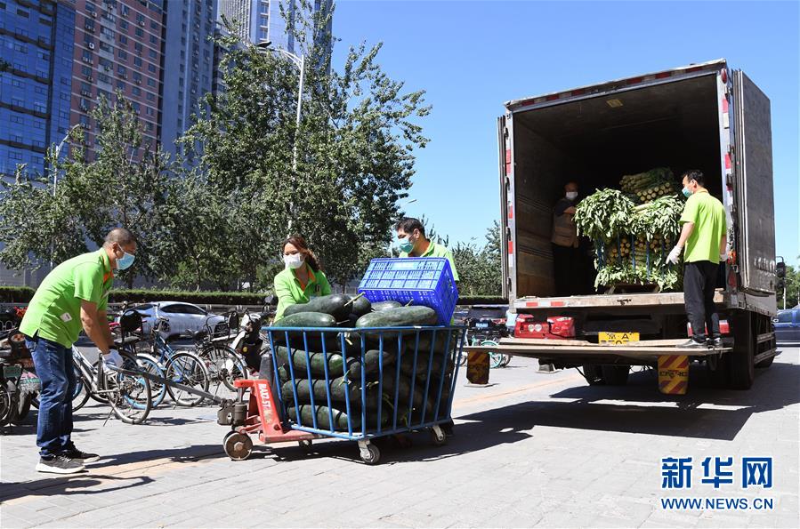 6月14日,在北京市海淀區(qū)的超市發(fā)雙榆樹店門口,工作人員在搬運(yùn)蔬菜。 新華社記者 任超 攝