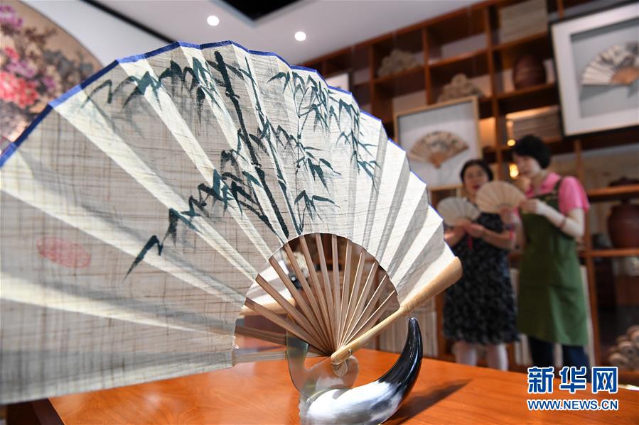 6月12日,非遺傳承人馬仁芬(左)與馬琳沁在探討夏布折扇的設(shè)計。新華社記者 唐奕 攝